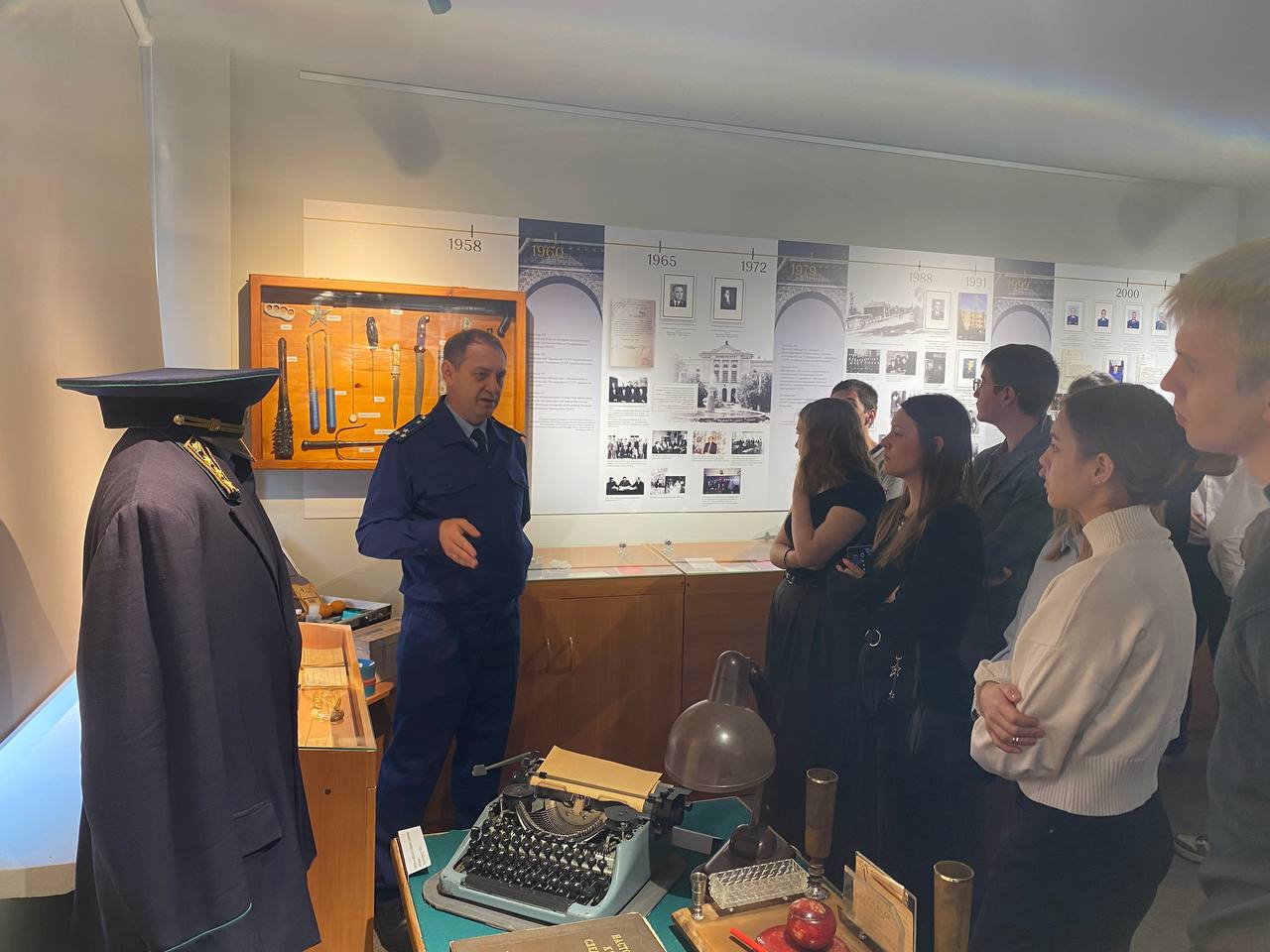 Завершилась встреча посещением музея прокуратуры региона. Студенты увидели экспонаты, форменную одежду и подлинные документы, отражающие работу ведомства в разные периоды времени, а также послушали рассказ об истории создания прокуратуры.