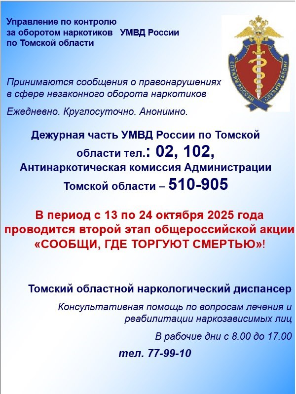 В Томской области стартует второй этап ежегодной общероссийской антинаркотической акции «Сообщи, где торгуют смертью». Он проходит с 13 по 24 октября текущего года.