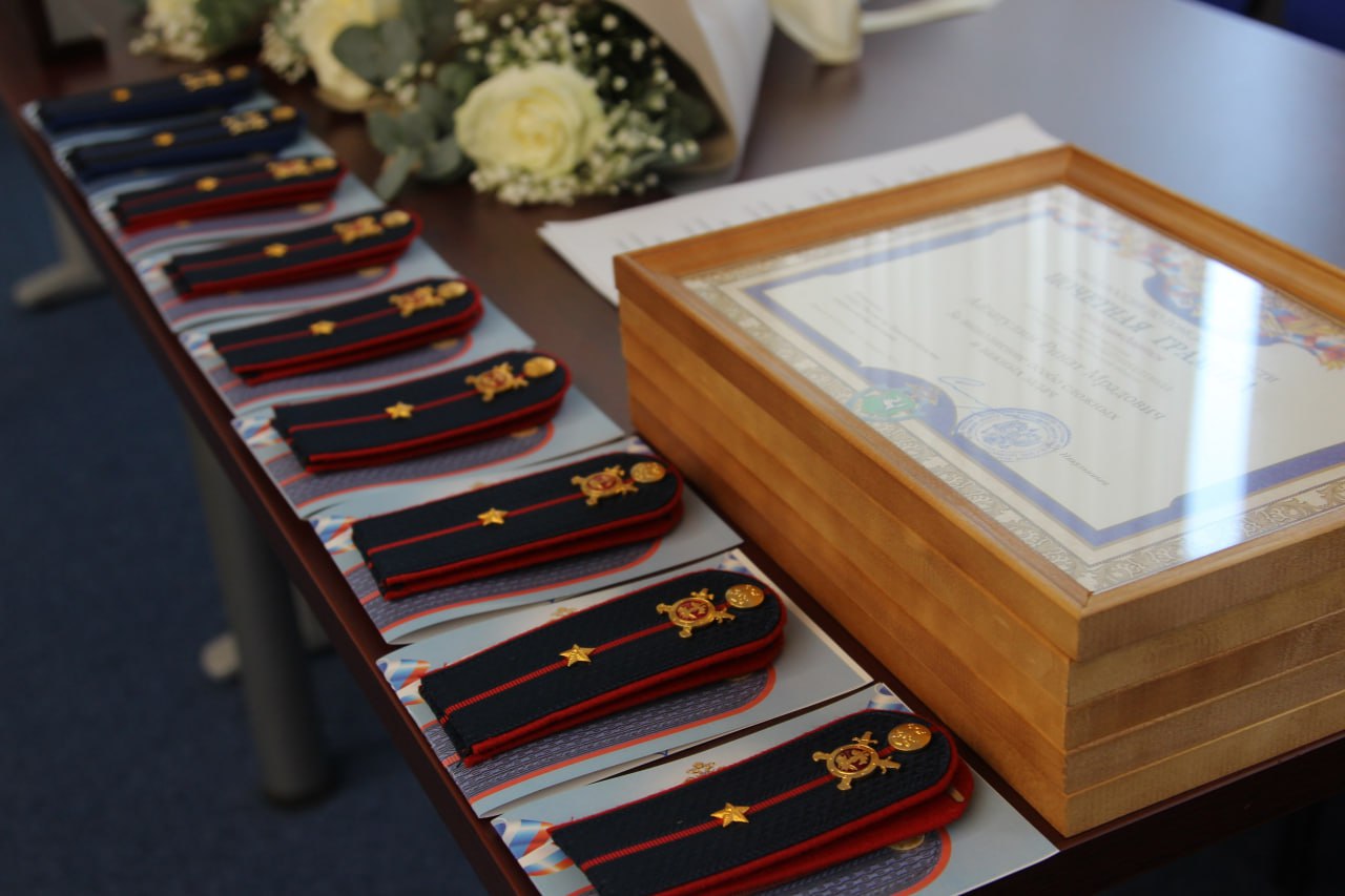 В продолжение мероприятия состоялось вручение первых офицерских званий. Александр Андреевич поздравил офицеров с присвоением специальных званий, пожелав крепкого здоровья и благополучия. Из рук Александра Никульникова лучшие наставники УМВД 2025 года получили почётные грамоты.