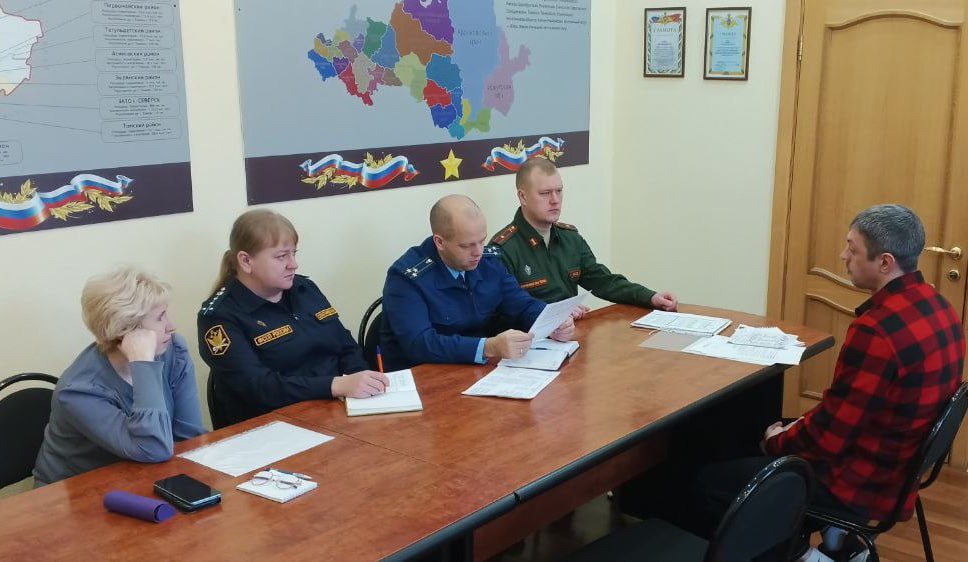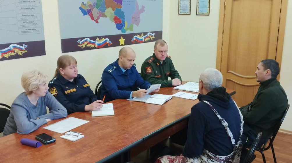 Встреча состоялась в военном комиссариате при участии военного комиссара Сергея Микова, социального координатора Томского филиала фонда «Защитники Отечества» Юлии Цепаевой и начальника местного отдела судебных приставов Юлии Севостьяновой.