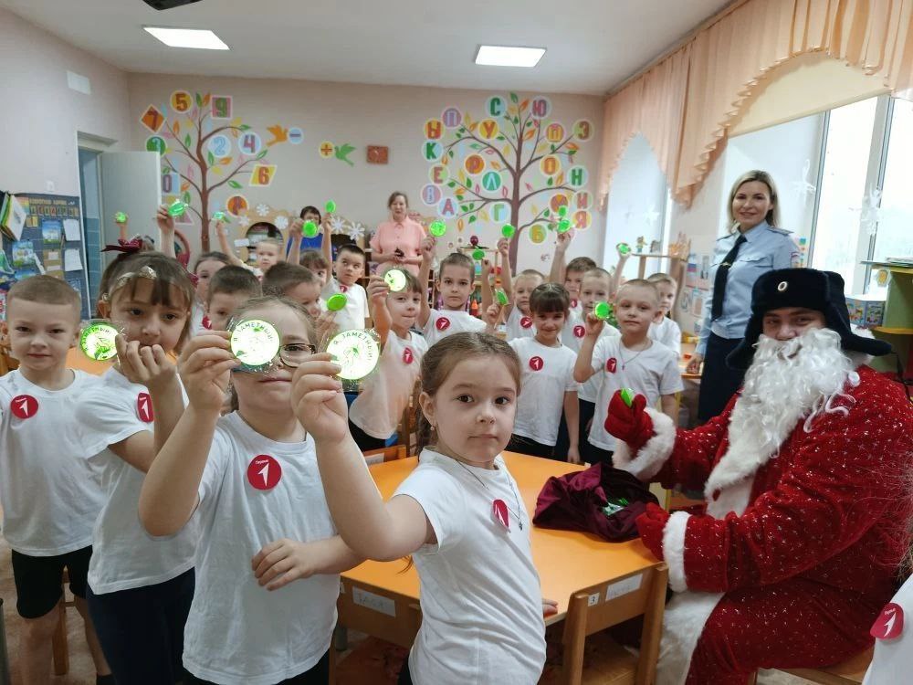 В подарок Полицейский Дед Мороз принес световозвращатели, а сотрудники Госавтоинспекции, разъясняли, где лучше их размещать, чтобы обеспечить их видимость для водителей.