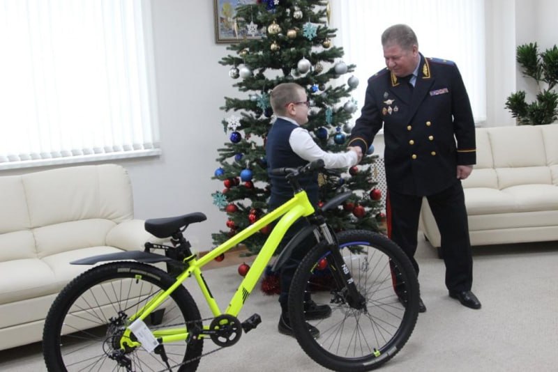 Начальник УМВД России по Томской области генерал-майор полиции Александр Никульников в рамках новогодней благотворительной акции «Ёлка желаний» исполнил новогоднюю мечту девятилетнего Ярослава из Томска - велосипед.
