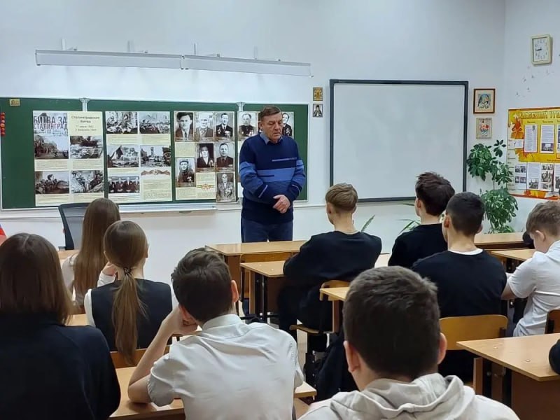 Владимир Егорович совместно с классным руководителем Тамарой Викторовной Шпенглер провели Урок Мужества в 8 «В» классе МСОШ №1 под названием «Сталинград: 200 дней мужества». Общественник рассказал о бессмертном подвиге героев, о сплочённости советского народа перед смертельной опасностью. Любовь Николаевна совместно с волонтерами и активистами МСОШ № 2 оформили выставку - инсталляцию «Город-герой - Сталинград».
