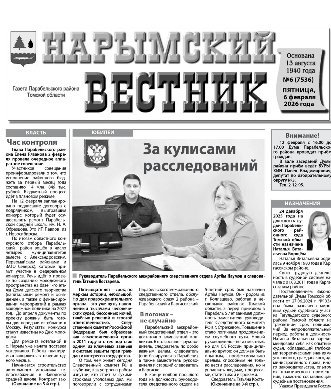 К 15-летию образования Следственного комитета Российской Федерации на страницах газеты «Нарымский вестник» вышел специальный репортаж, посвященный будням Парабельского межрайонного следственного отдела. В интервью журналисту издания руководитель отдела Артем Наумов и сотрудники следственного подразделения рассказали о специфике работы на территории северных районов Томской области и особенностях расследования тяжких преступлений в глубинке. Предлагаем вашему вниманию материал о сотрудниках, для кого девиз ведомства «Чужой беды не бывает» является главным профессиональным и жизненным ориентиром.