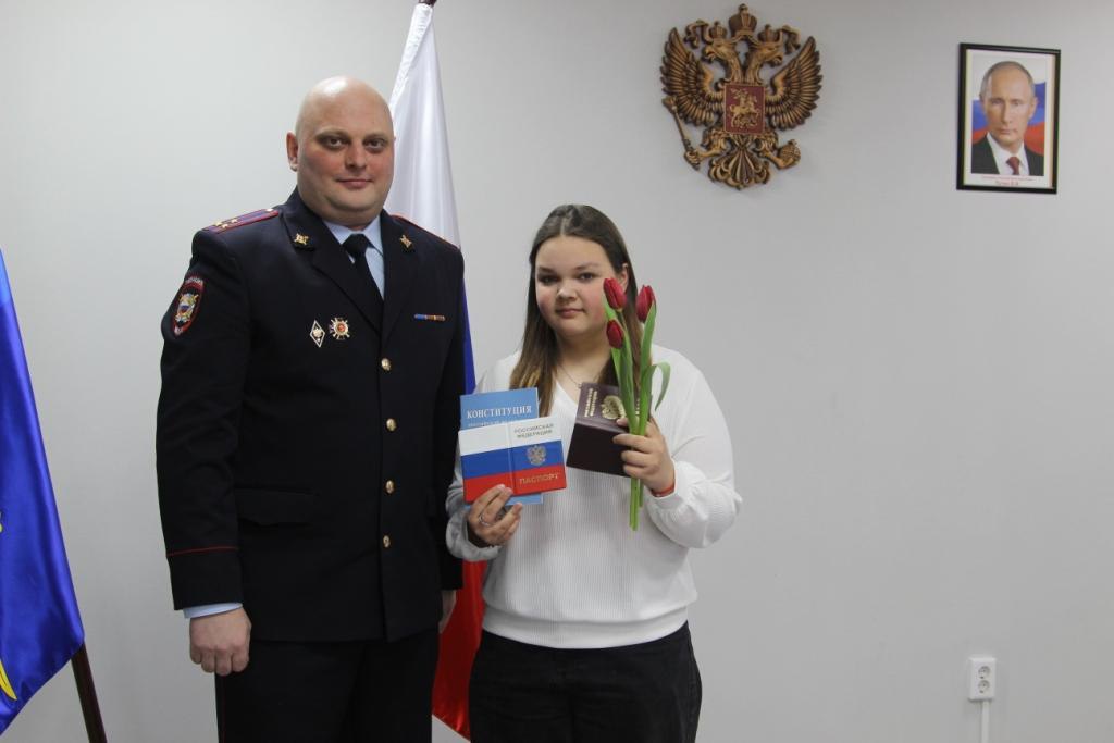 Сотрудники полиции поздравили ребят с этим знаменательным событием, вручив самый главный документ в их жизни – паспорт гражданина Российской Федерации. Полицейские рассказали историю появления российского паспорта и акцентировали внимание на необходимости бережного к нему отношения. Вместе с паспортом юным гражданам были вручены Конституции Российской Федерации и обложки на паспорта с государственной символикой.