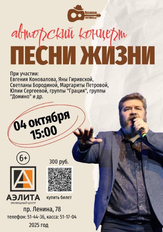 В субботу, 4 октября, в 15.00 в зрелищном центре «Аэлита» (пр. Ленина, 78) состоится авторский концерт «Песни Жизни» под руководством Виктора Юргенса.Зрителям будет представлен музыкальный спектакль от «Творческой...