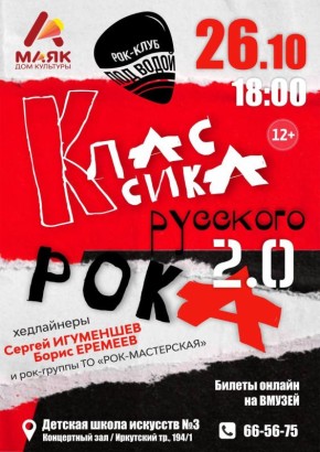 В воскресенье, 26 октября, в 18.00 в концертном зале Детской школы искусств №3 (Иркутский тракт, 194/1) состоится рок-концерт «Классика русского рока 2.0».На живом концерте прозвучат легендарные композиции популярных групп, которые...