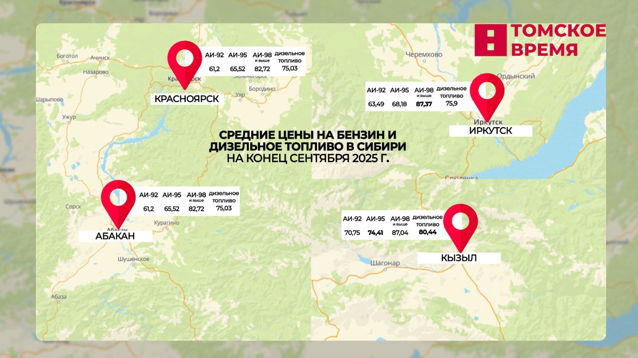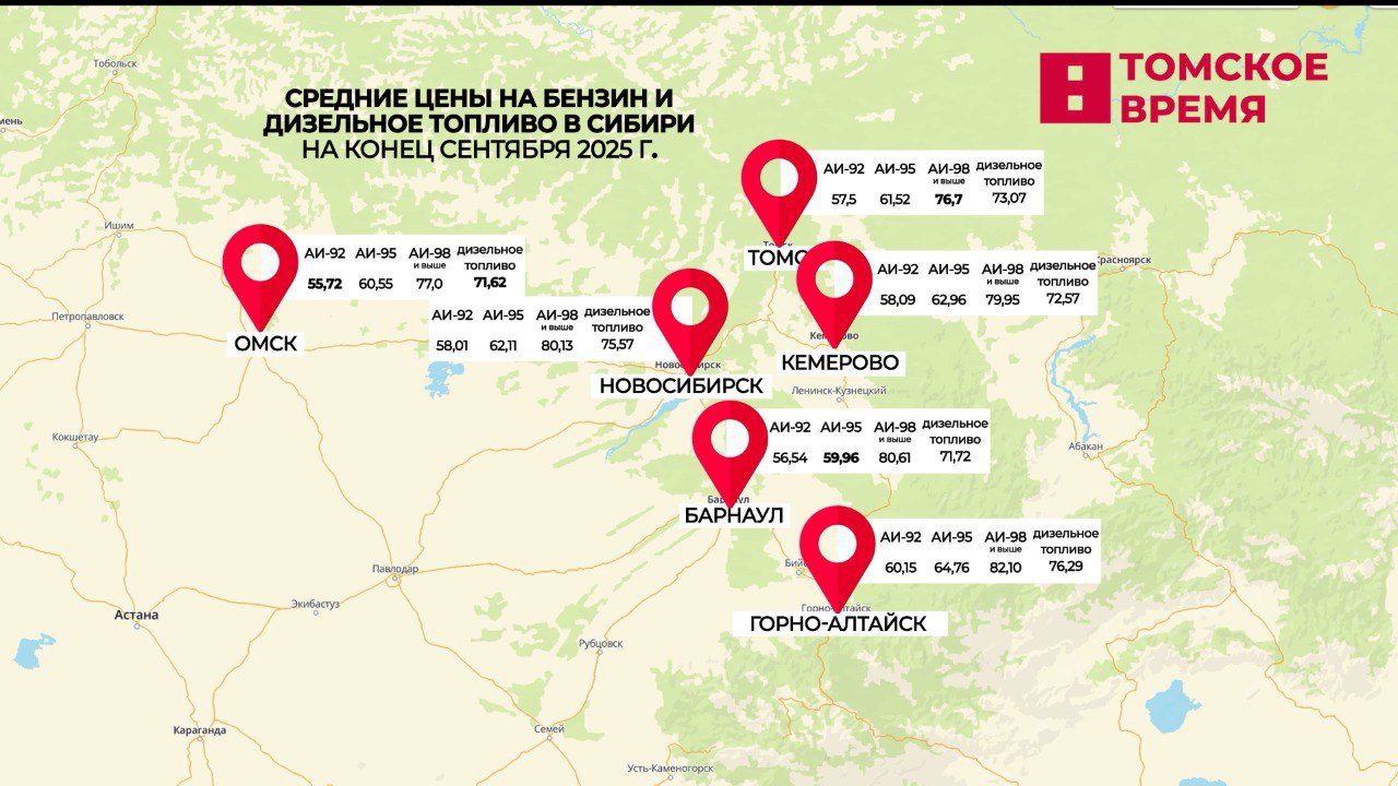Томскстат поделился статистикой средних цен по Сибири на бензин и дизельное топливо. В сентябре по сравнению с декабрем 2024 года их стоимость изменились следующим образом: