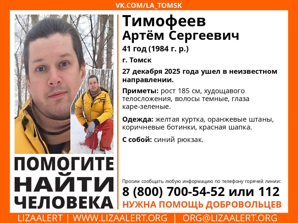 Приметы пропавшего: рост 185 сантиметров, темные волосы, каре-зеленые глаза, худощавое телосложение. Он одет в желтую куртку, оранжевые штаны, красную шапку и коричневые ботинки