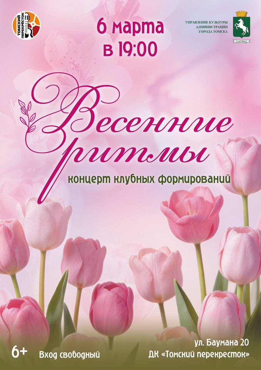 В пятницу, 6 марта, в 19.00 в Доме культуры «Томский перекрёсток» (ул. Баумана, 20) состоится праздничный концерт клубных формирований «Весенние ритмы», посвящённый Международному женскому дню. Специальным гостем программы станет приглашённая группа «АВЕРС».