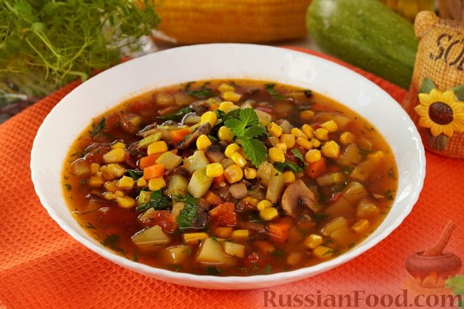 - Суп из кабачков с грибами и кукурузой: легкое и ароматное блюдо, в котором сочетаются свежесть кабачков, нежный вкус шампиньонов и сладость кукурузы.