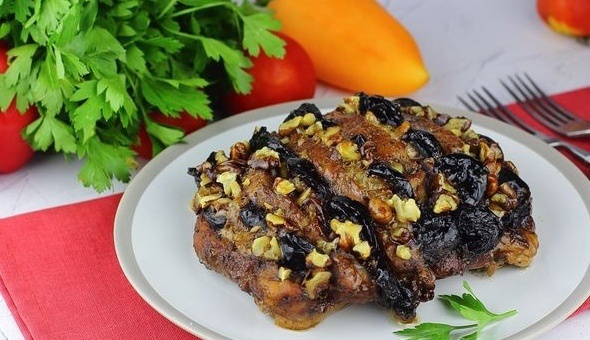 Разогрейте духовку до 180 градусов. Чернослив тщательно промойте и обсушите, при желании нарежьте на мелкие кусочки. Орехи тоже нужно нарезать. Затем подготовьте полоску фольги, как минимум в два раза больше мяса.