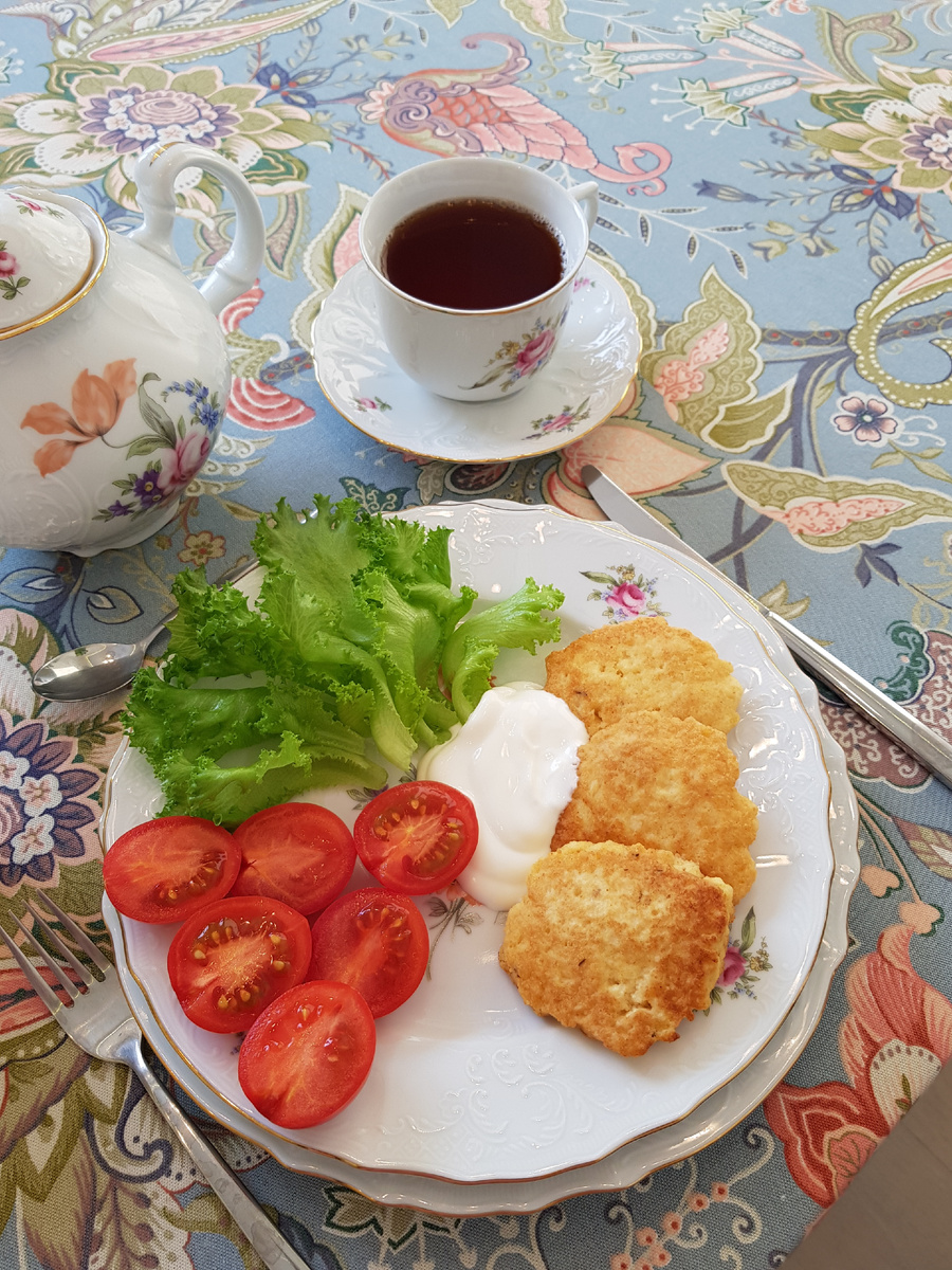 Для подачи на тарелку выложить свежие промытые листья салата, оладьи и аккуратно нарезанные помидоры. Дополнить ансамбль сметаной для полной гармонии вкусов. Приятного аппетита!