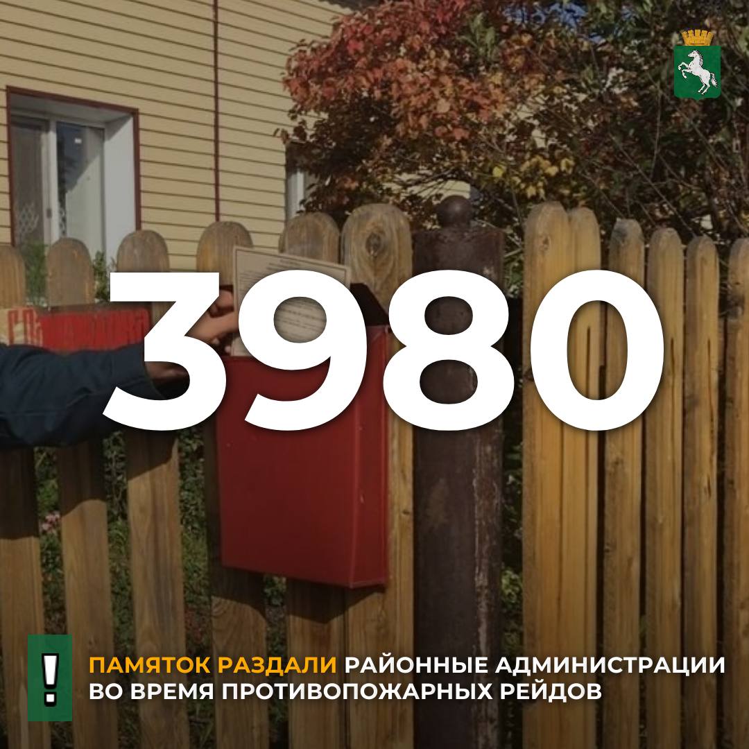 Сотрудники районных администраций ежедневно, включая выходные дни, проводят профилактические рейды по противопожарной безопасности. С начала года специалисты раздали 3980 информационных памяток с напоминаниями о правилах противопожарной безопасности.