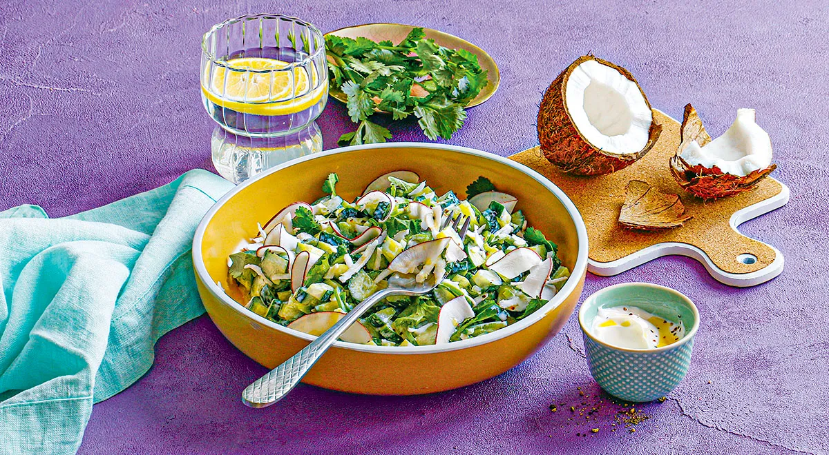 Это чудесное сочетание охлаждающего йогурта, хрустящего огурца и ароматного кокоса станет замечательным сопровождением к индийским угощениям, таким как бирьяни, пилав или кебабы, и идеально будет смотреться с хлебом чапати или нааном.
