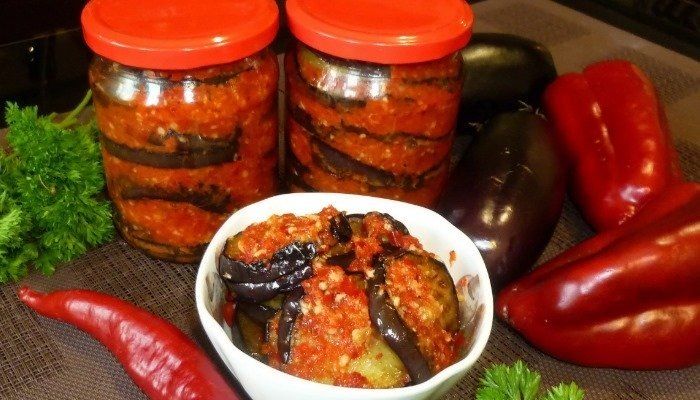 Перемолотое овощное пюре помещается на огонь, после чего добавляются растительное масло, уксус, соль и сахар. Жидкость доводится до кипения и в неё отправляются баклажаны. Нужно тушить массу на небольшом огне около 30 минут.