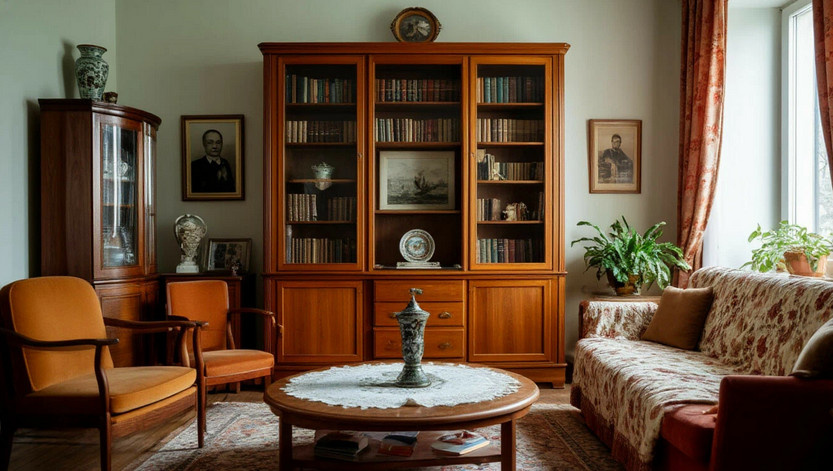 Советские квартиры характеризовались отсутствием ненужных предметов. Вместо избыточного декора находили разнообразные функциональные вещи: вазы только с живыми цветами, книги на полках и несколько семейных фотографий на стенах. Даже кружевные салфетки служили защитой для мебели, подчеркивая практичный подход к каждому аспекту быта.