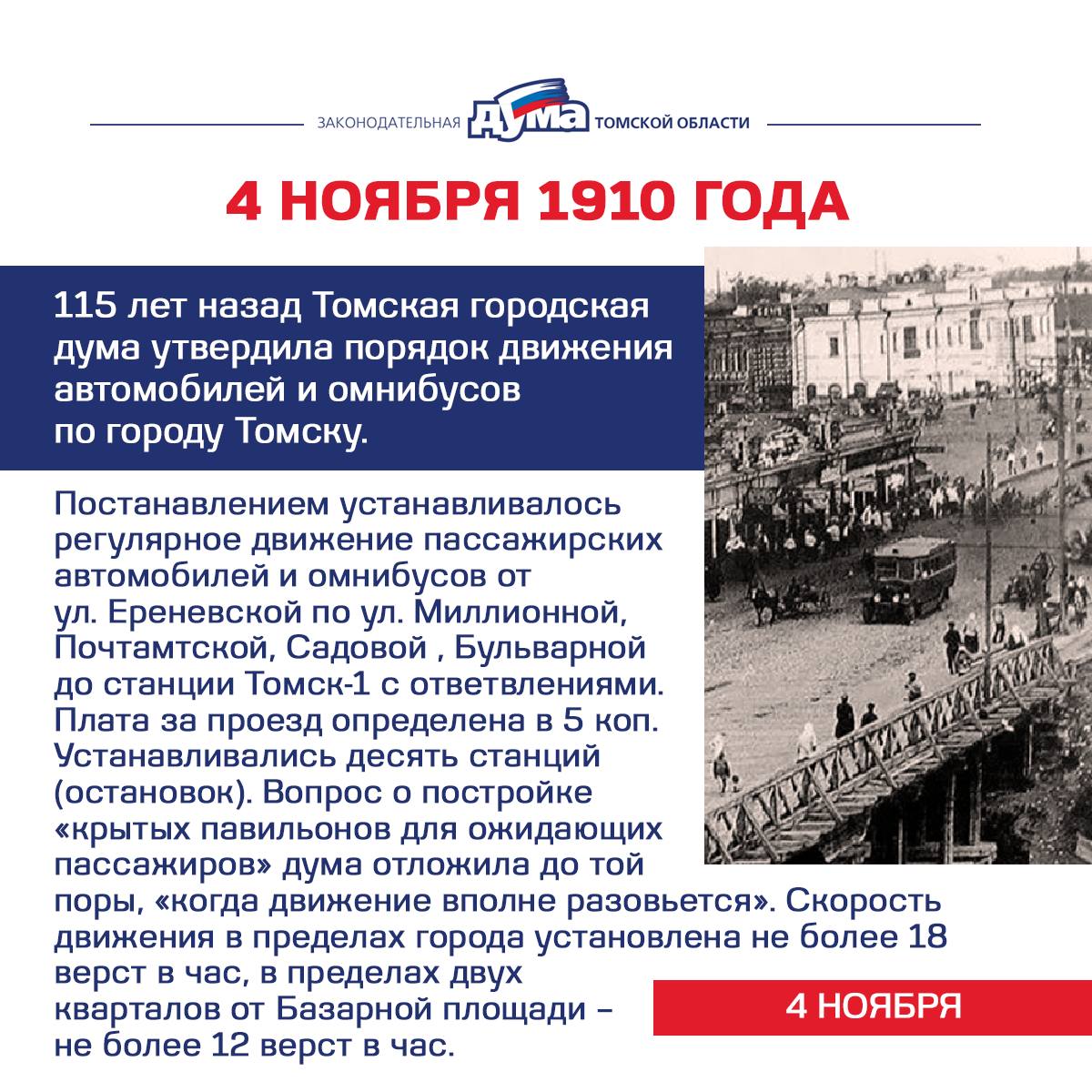 Сегодня рассказываем о правилах движения омнибусов по улицам Томска, создании Томского округа взамен губернии и других событиях, произошедших с 3 по 9 ноября в разные годы Томской истории.