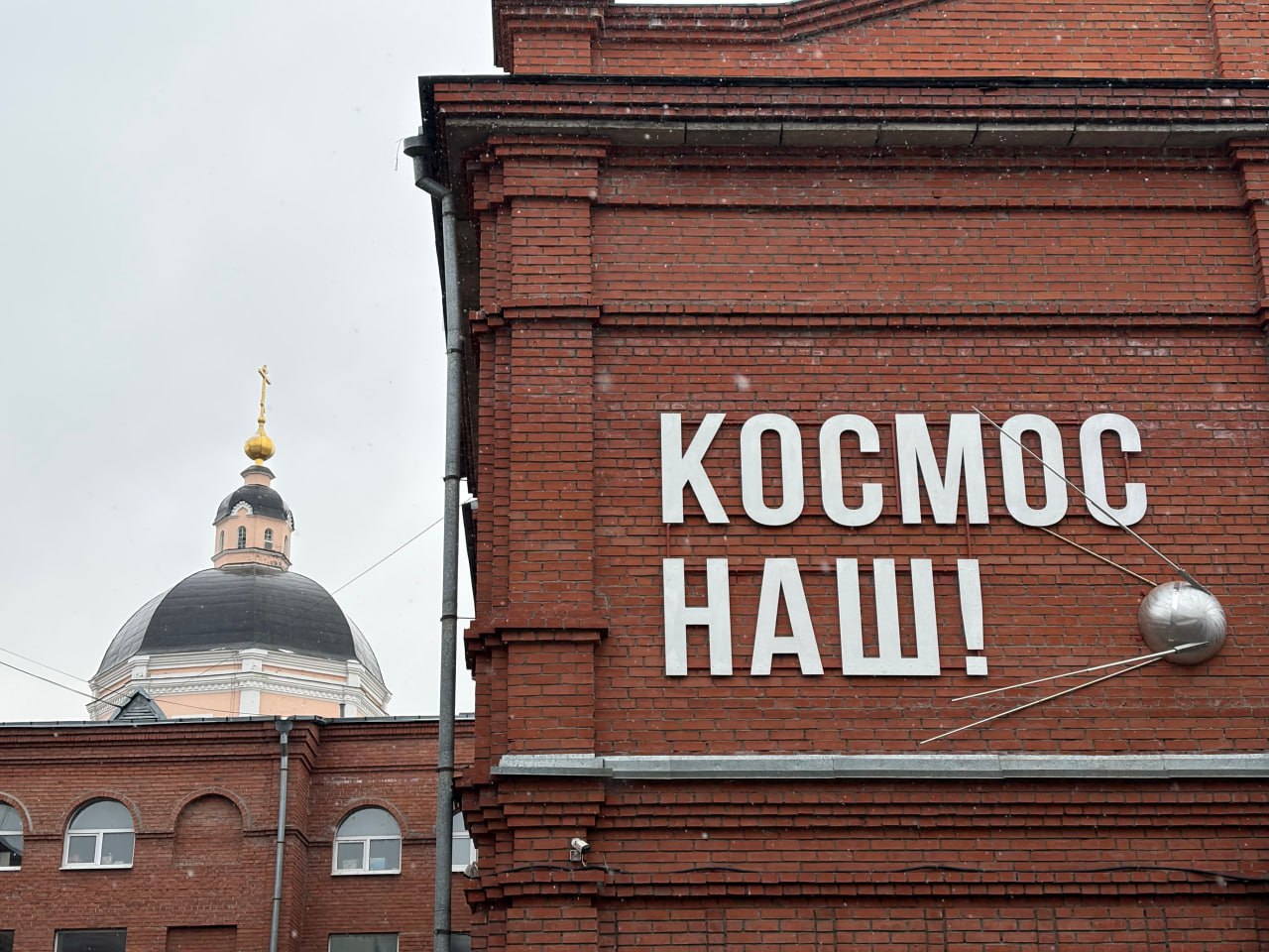 На композиции изображен легендарный космонавт Николай Рукавишников, а рядом — ракета и луноход, символы стремления к открытиям и научным свершениям.