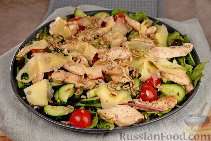 - Салат с курицей и овощами: Куриное филе в сочетании с хрустящими овощами и ломтиками сыра создаёт идеальный баланс вкусов. Заправить растительным маслом и лимонным соком — простое, но эффективное решение.