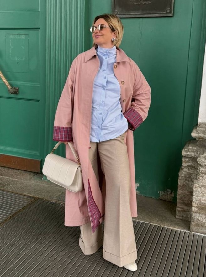 - Расклешенные брюки в песочно-бежевых тонах: Эти штаны с стрелками идеально подходят для создания стильного и утонченного образа. Сочетайте их с бледно-голубой рубашкой и длинным пальто розового оттенка с клетчатой отделкой для достижения максимального эффекта.