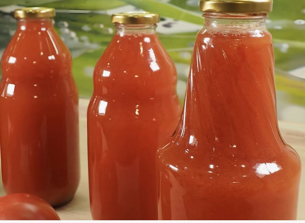 Приготовление: Томатам нужно 2 минуты бланшировки, после чего с них снимают кожицу. Далее их измельчают с помощью блендера и пропускают через сито. Добавляют специи и доводят до 90°C. Готовый сок разливают в банки, которые тоже следует подготовить заранее.