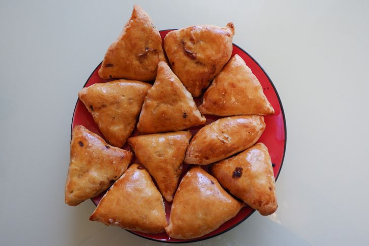 На каждый из них нужно выложить по 1 столовой ложке начинки, после чего сложить прямоугольники пополам, залепить края, сделать на тесте несколько надрезов. Выпекать пирожки нужно на противне, застеленном пергаментом, при 200 градусах на протяжении 15 минут.