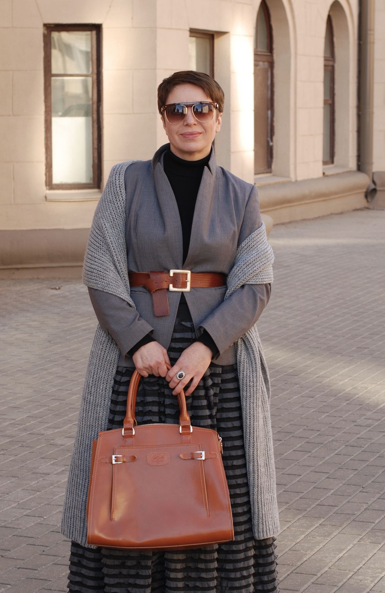 - Кожаная сумка. Аксессуары играют важную роль в создании стиля. Кожаная сумка с жестким каркасом придаст образу завершенность. Стильный дизайн без лишних деталей – это то, что нужно.