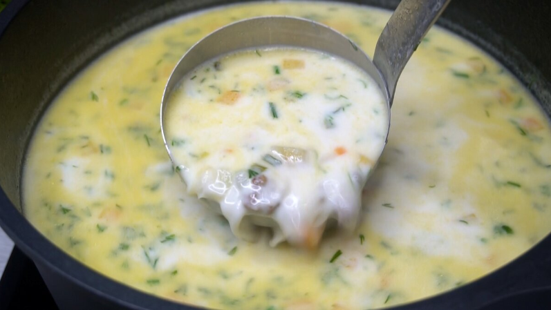 После этого в блюдо добавляется плавленый сыр и сливки. Все хорошо перемешивается и варится еще несколько минут. В завершение цвет супа украсят свежий укроп и душистые специи, которые только добавят аромата готовому блюду.