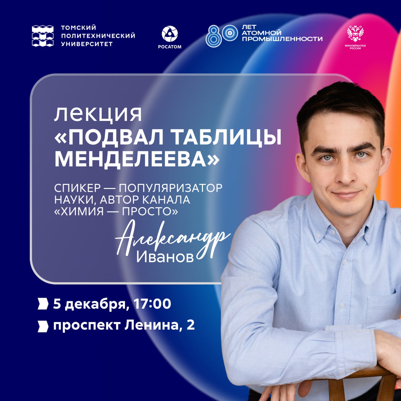 В Томском политехническом университете с открытой лекцией "Подвал таблицы Менделеева" выступит популяризатор науки, автор канала "Химия – просто", автор книги "Химия – просто: история одной науки", ведущий инженер кафедры редких металлов и наноматериалов физико-технологического института УрФУ Александр Иванов.