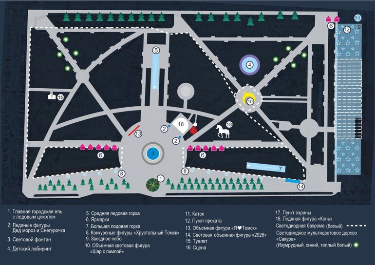 Каток под «Звездным небом» откроют 19 декабря — вместе с огнями главной елки. В новогоднюю ночь на площади будет звучать музыка.