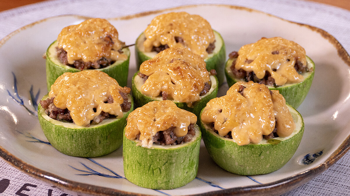 Кабачки нарезаются поперек на части толщиной около трех сантиметров, после чего из них аккуратно удаляется часть мякоти, создавая пространство для начинки. Начините кабачки фаршем и выложите их на противень с пергаментной бумагой. Для соуса объединим майонез, соевый соус и лимонный сок, а затем равномерно распределите его по начинённым кабачкам. Запекайте в предварительно разогретой до 210 градусов духовке в течение 10 минут.