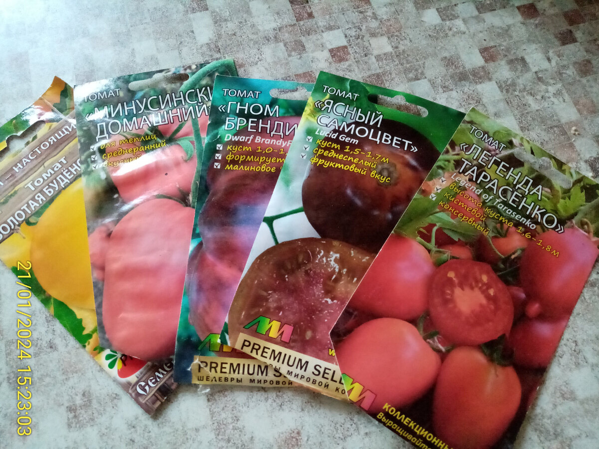 - Томаты: Золотая Будёновка (крупная), Оранжевая гирлянда (черри), Минусинский домашний, Гном Брендифред и другие.
