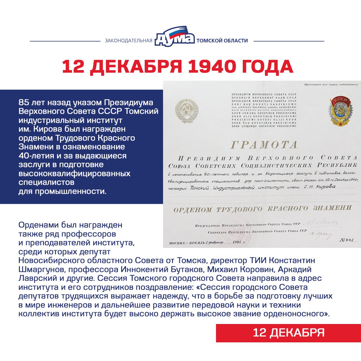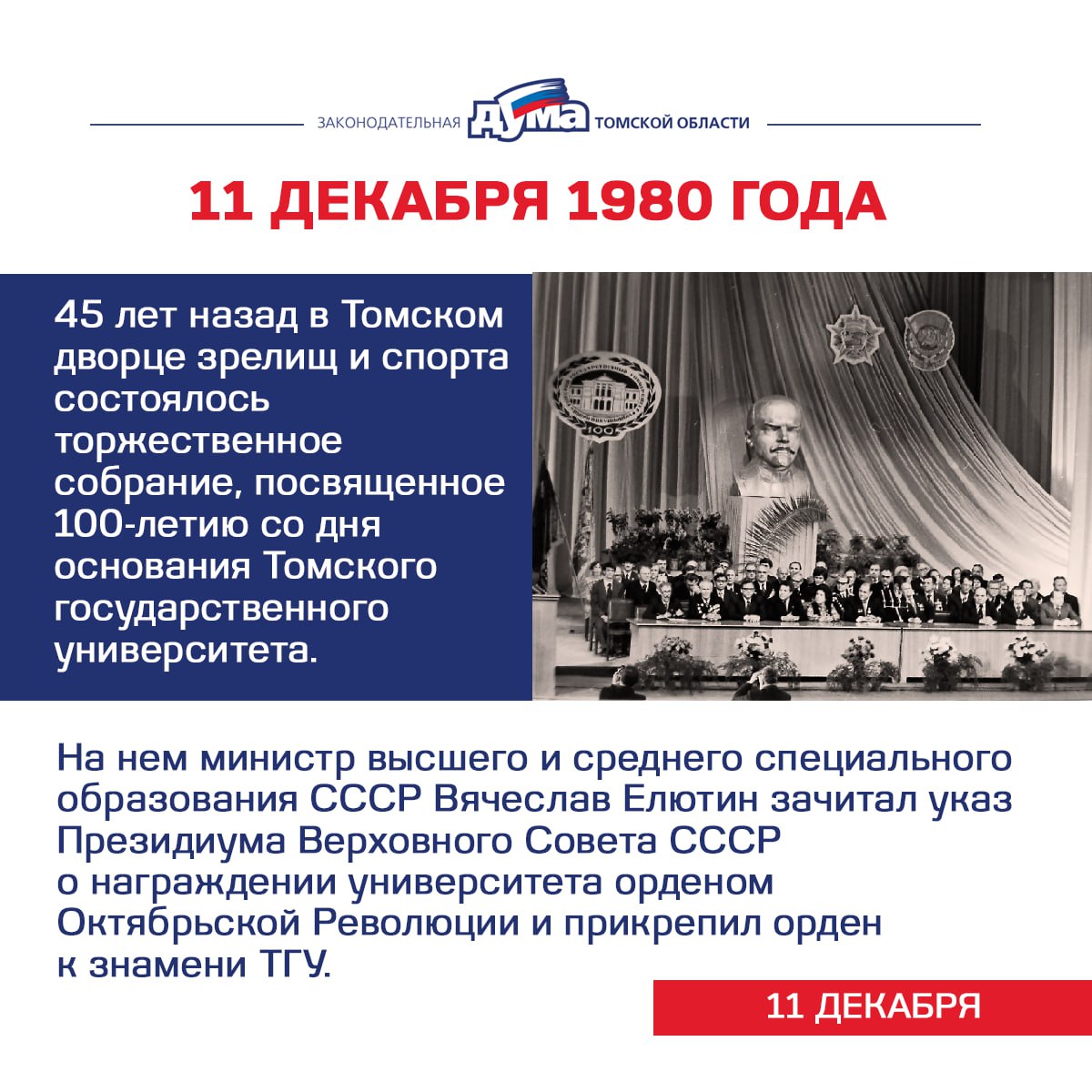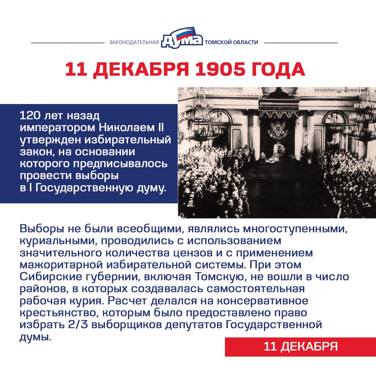 Неделя с 8 по 14 декабря вместила в себя указ императора о проведении выборов в Государственную думу России, а также решения высшего законодательного и представительного органа государственной власти СССР о награждении двух томских высших учебных заведений орденами.