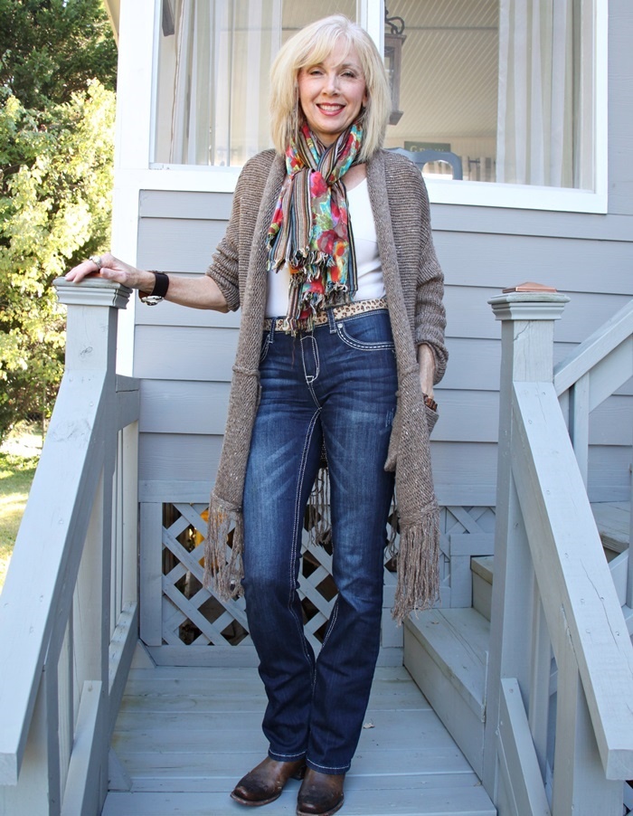 - Джинсы: Никакой другой предмет одежды не сможет так эффективно освежить образ. Идеальные джинсы для женщины 50+ – это классические модели, которые хорошо сидят, средней посадки и без излишних дырок или выбеливания. Они отлично сочетаются с футболками, блузками и жакетами, добавляя современную нотку в любой наряд.