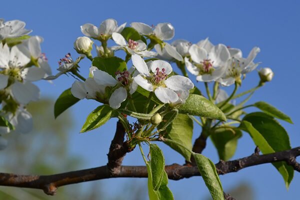 - Цветение у груши Петровской — это зрелище, когда средние по размеру цветки с овальными лепестками окрашиваются в белый цвет, создавая невероятно красивый пейзаж во время цветения.