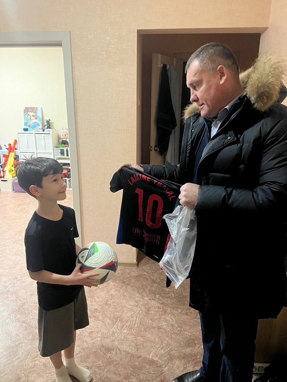 Александр Копанчук порадовал юного футболиста Мирона комплектом формы его любимого игрока и профессиональным мячом.