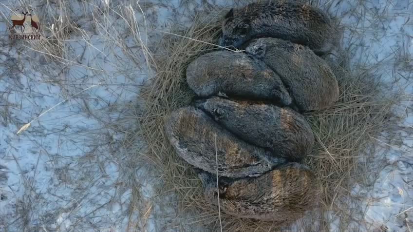Животных заметили во время одного из недавних обследований заказника. Кабаны сделали гнездо из тростника и плотно улеглись в нём, спасаясь от мороза.