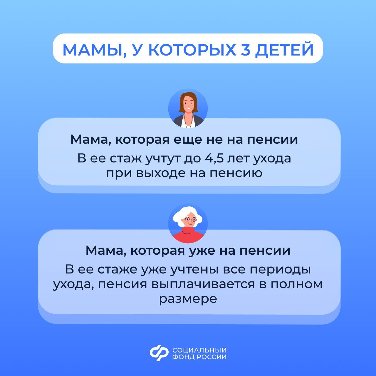 Напоминаем, что для выхода на страховую пенсию необходимо иметь 15 лет стажа и индивидуальный пенсионный коэффициент в размере 30. Также для многодетных мам предусмотрен досрочный выход на пенсию.