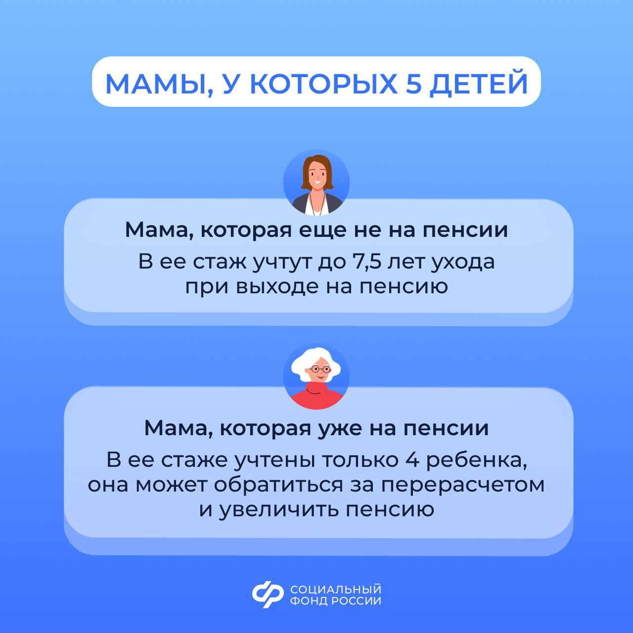 Если вы мамы 5 и более детей и уже вышли на пенсию, то вы можете подать заявление в Соцфонд для перерасчета пенсии:
