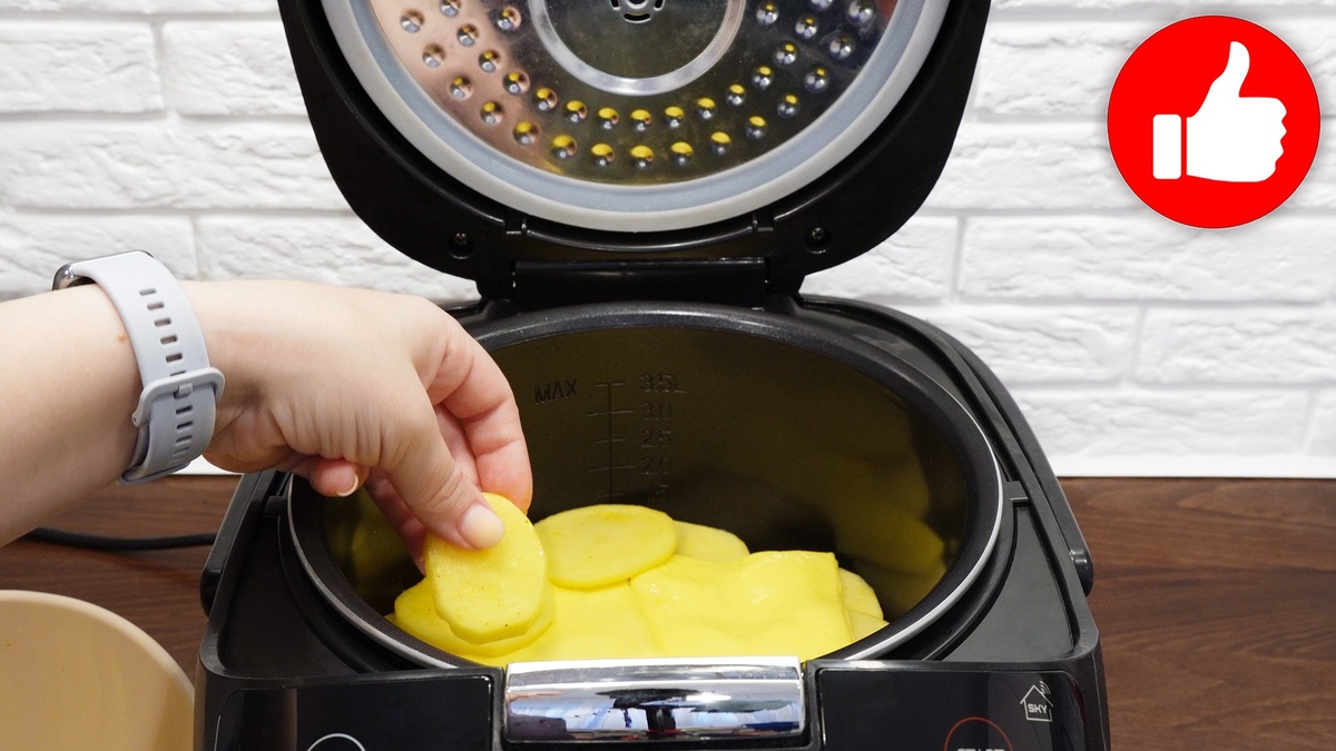 Начинается всё с нарезки картофеля кружочками. Каждую дольку следует смешать с приправами, чтобы придать дополнительный вкус. Далее, в чашу мультиварки наливается растительное масло. На дно чаши помещаются слои картофеля, которые чередуются с плавленым сыром. После этого добавляется холодная вода, что в процессе готовки обеспечит нужную влажность.