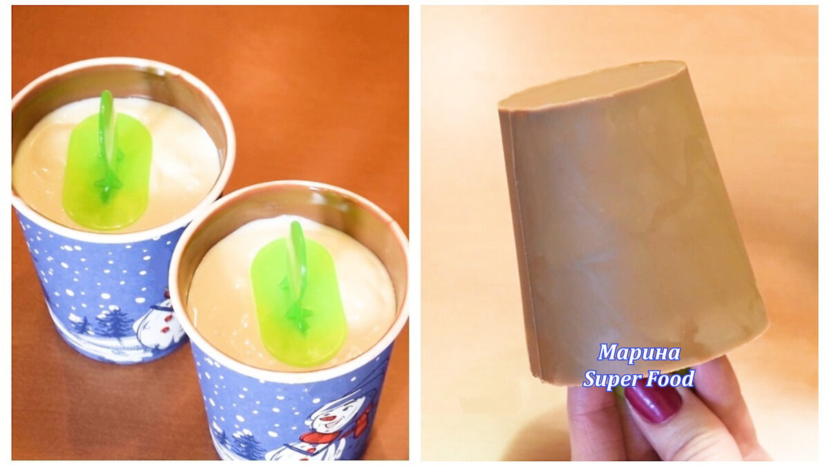 В результате получится легкая и однородная масса. Эту массу осторожно распределить по подготовленным стаканчикам и снова убрать в морозильную камеру, где она должна застыть минимум 3 часа.