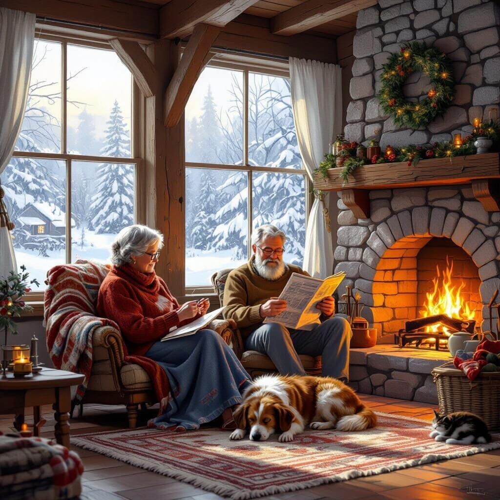 Вечерами, когда воздух наполняется духом праздника, многие предпочитают созерцать уютные новогодние картины. На них изображены пожилые пары у камина с бокалами вина или книгами в руках, окутанные теплом и спокойствием.