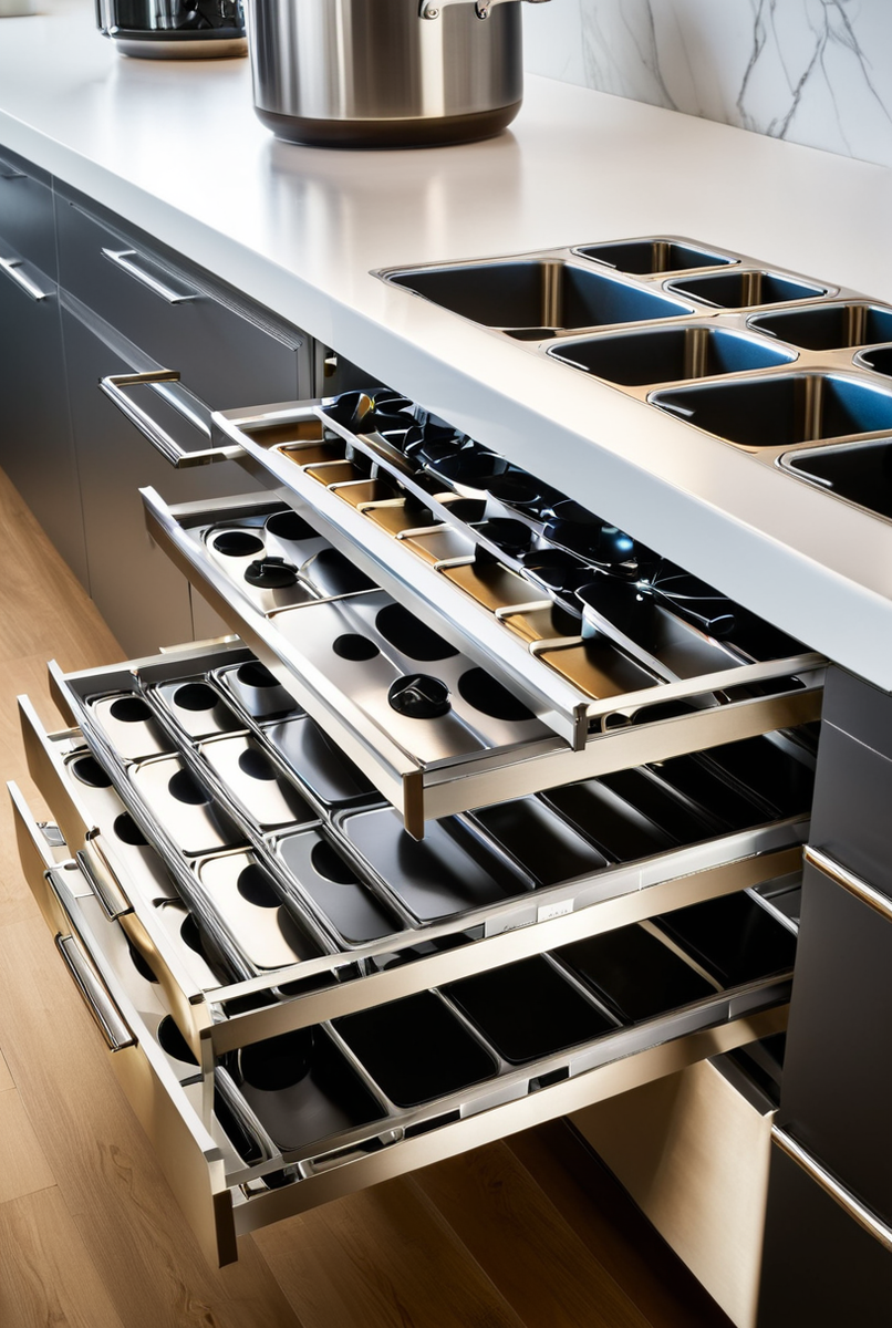 - Разделители: Создайте ячейки нужного размера, чтобы адаптировать пространство под различные крышки, включая крышки от сковородок. Это гарантирует легкий доступ к каждому элементу.
