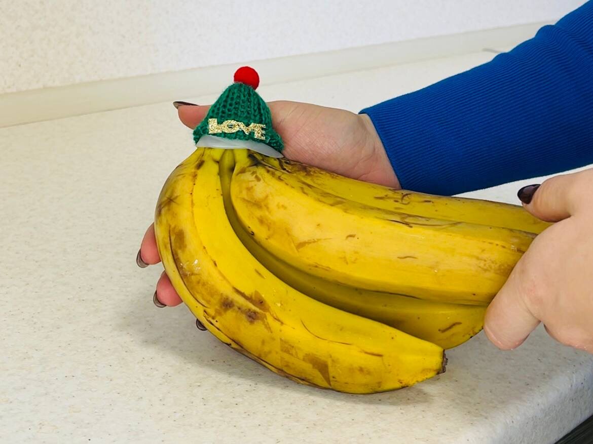 Еще одна идея — безопасная шапочка для бананов. Это эластичная вставка и миниатюрная вязаная шапочка, которую можно надеть на верхушку связки. Альтернатива: фольга или пленка тоже сохраняют бананы дольше, а вязаная версия выглядит необычно.