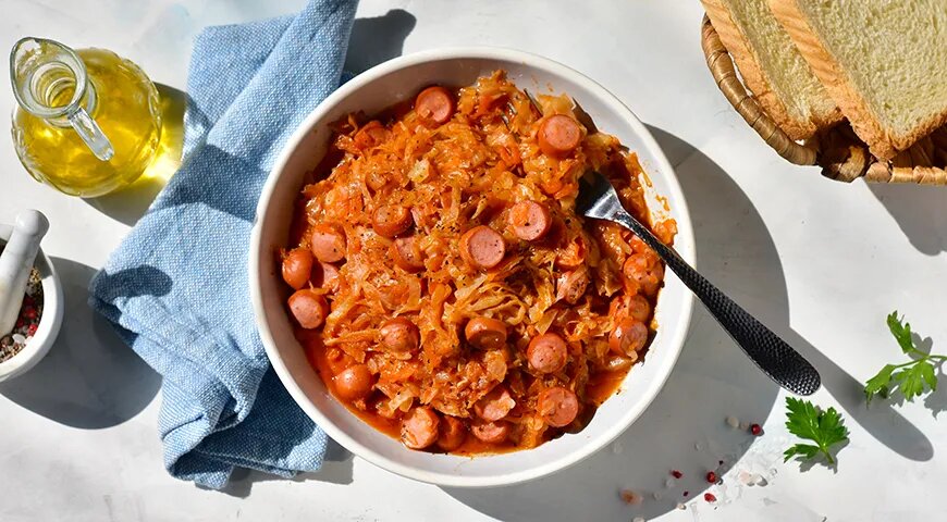 Капуста с сосисками и томатной пастой