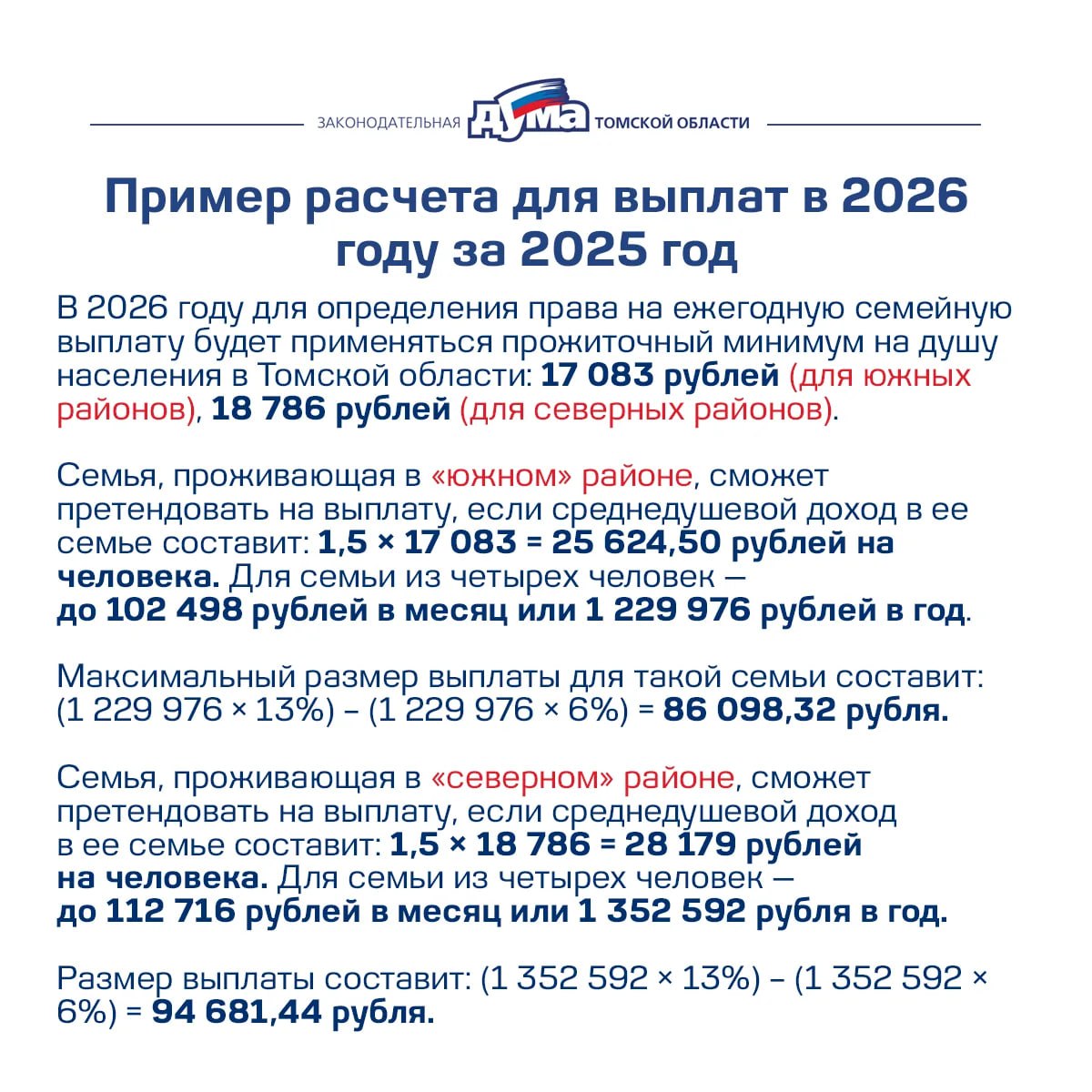 С 1 января 2026 года вступил в силу федеральный закон об установлении родителям с двумя и более детьми, имеющим невысокие доходы, ежегодной выплаты в виде частичного возврата уплаченного налога на доходы физических лиц (НДФЛ). Ранее депутаты Законодательной Думы Томской области поддержали эту законодательную инициативу.