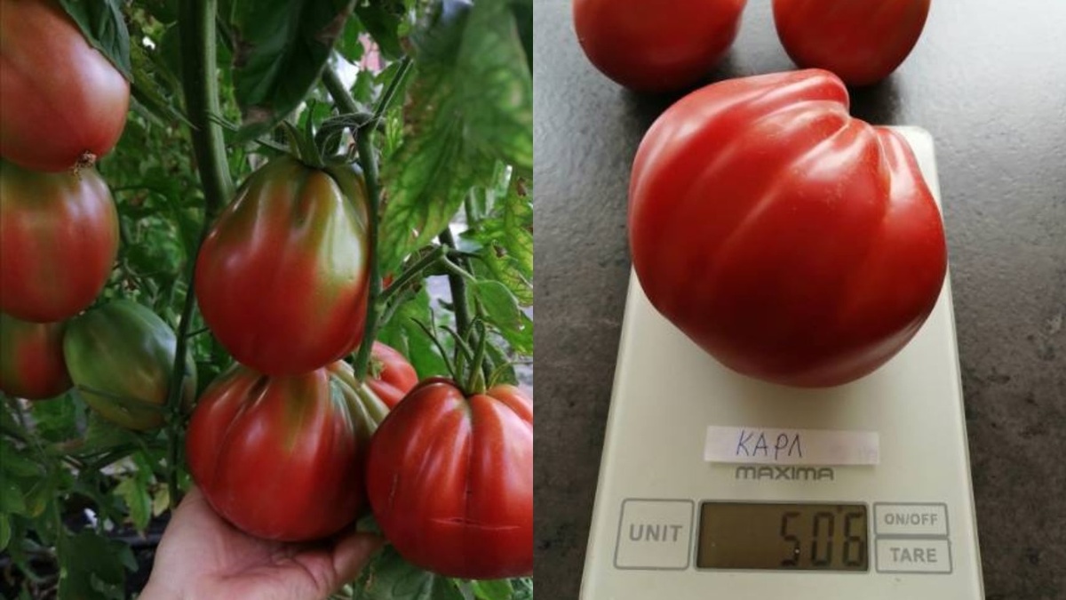 В этом году автор опыта начал сеять семена грушевидных томатов, выбрав дату 5 марта. В теплице поддерживались комфортные условия: температура днем колебалась от 22 до 25 градусов, ночью - от 16 до 18. Первым в рост пошел сорт "Карл", который проявил невероятную силу - его кусты достигли более двух метров, а сами плоды весили около 200 грамм, формируясь по 5-6 штук в кисти.