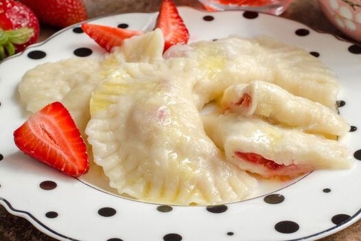 В кипящую воду осторожно опускают первую партию вареников. Как только они всплывут, продолжаем варить их на среднем огне 3 минуты. После варки вареники выкладывают на тарелку, поливают растопленным сливочным маслом и украшают оставшимися клубничками.