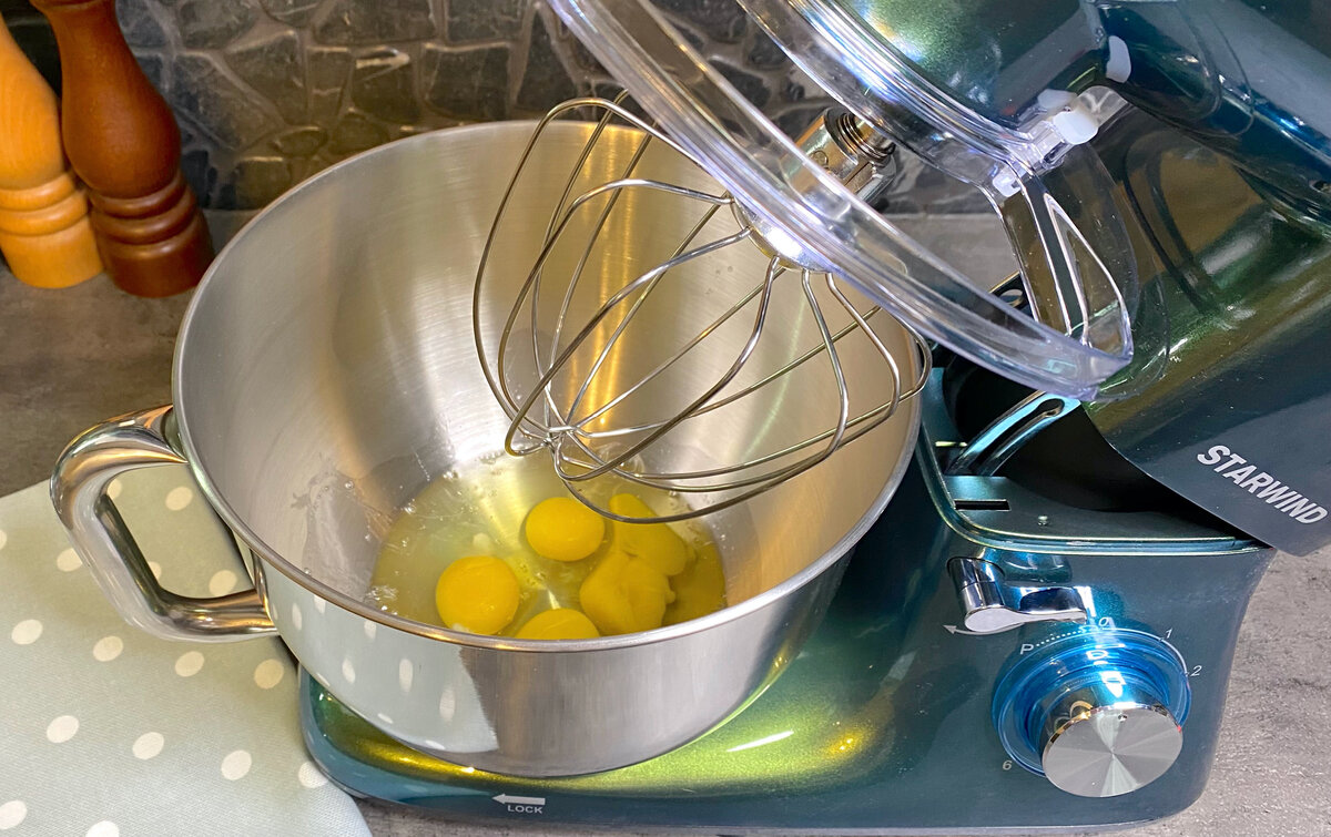 Взбивание яиц: В миску для миксера помещаются яйца. После этого добавляется сахар. Взбивать стоит на небольшой скорости, а затем увеличить до средней, пока масса не увеличится втрое и не приобретет светлый оттенок.